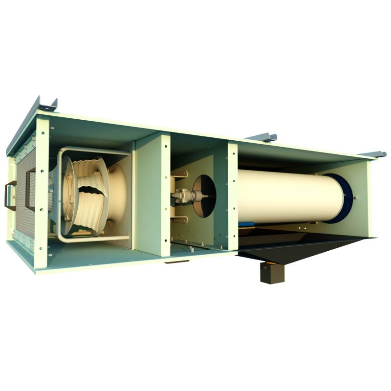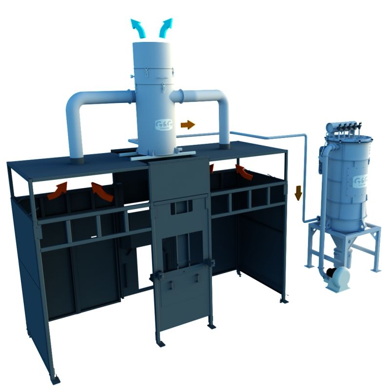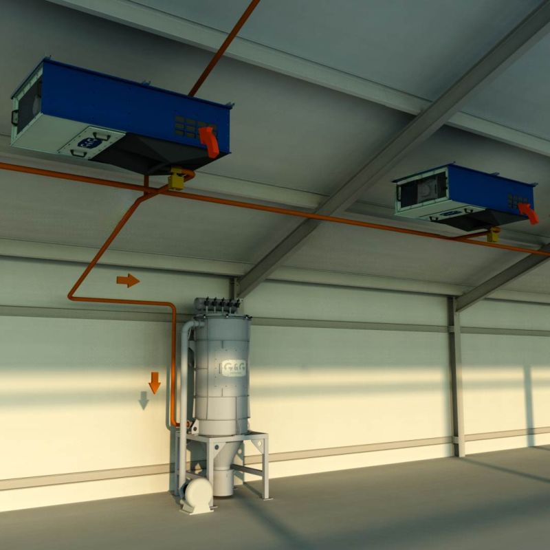 Oproti konvenčnímu řešení prostorového odsávání, kdy je vzdušnina odsávána nad pracovními stanicemi v prostoru pod stropem a dopravována do centrální filtrační jednotky dlouhými potrubními rozvody je naše řešení jednodušší a energeticky úsporné. Pod strop haly jsou nad jednotlivé pracovní prostory instalovány lokální filtrační jednotky EcoAirCleaner, které zajišťují filtraci vzduchu přímo pod stropem svařovny. Prostor výrobní haly není zastavěn složitými potrubními rozvody. Odvod prachu z podstropních jednotek je řešen centralizací odpadu vysokotlakým vysavačovým systémem Vacuum JET. Přefiltrovaný vzduch je z jednotek je vyduchován jednotkou zpět do prostoru haly. Veškeré filtrační jednotky decentrálního systému spolu komunikují přes ModBus a jsou ovládány z jednoho centrálního místa. Jedná se o námi vyvinutý systém, který významným způsobem šetří náklady na elektrickou energii. Systém je jednoduše rozšiřitelný doplněním dalších jednotek a připojením k centralizaci odpadu.