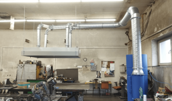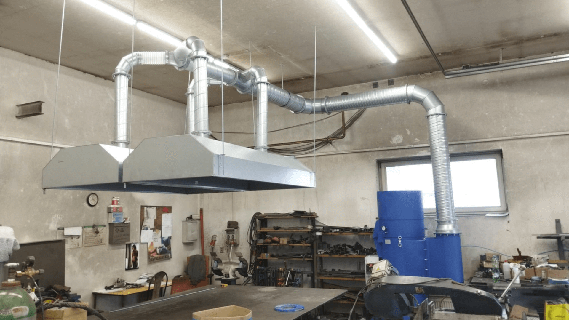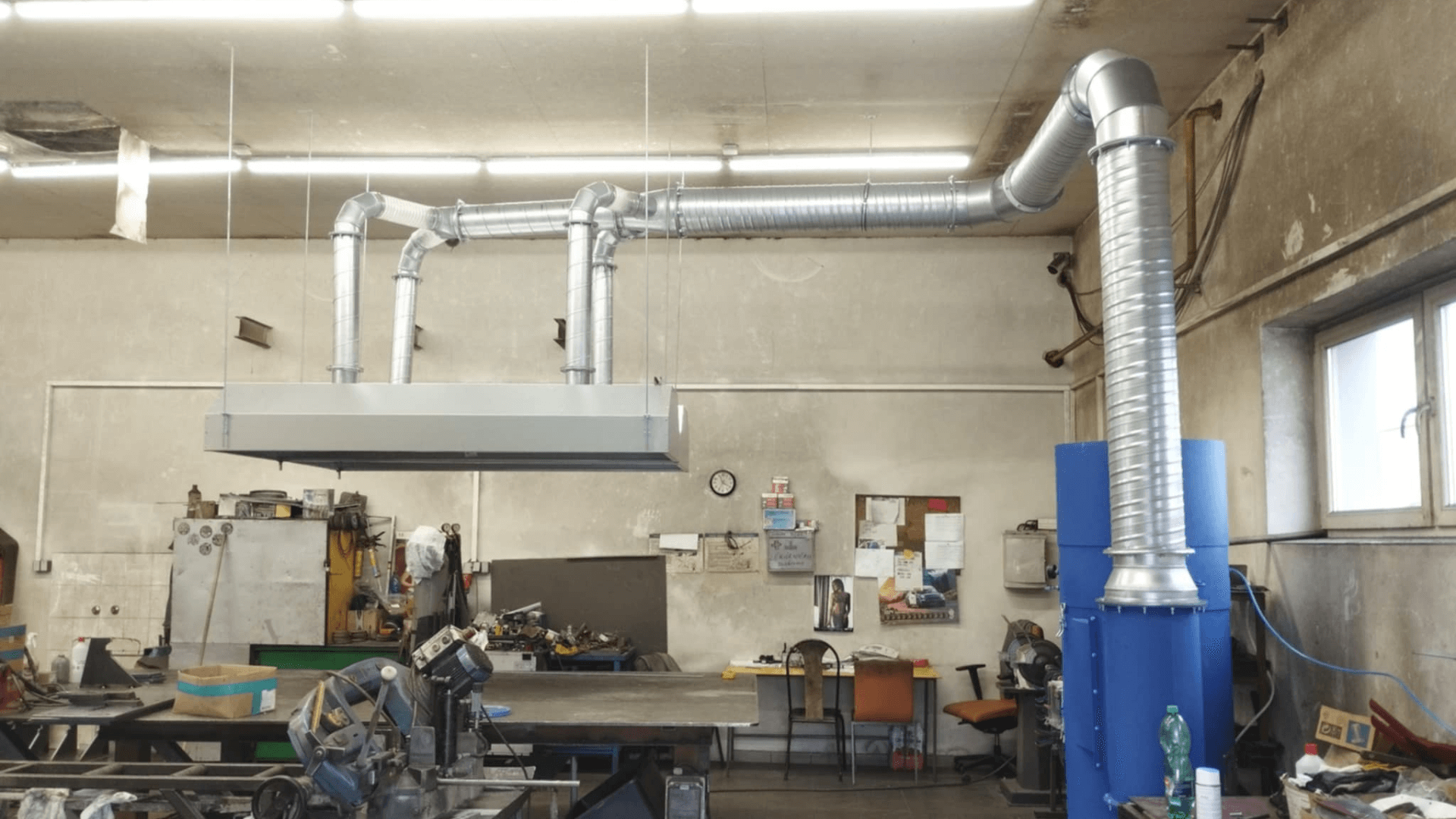 Odsávací potrubí z pozinkovaného plechu je vedeno ke kompaktní filtrační jednotce.