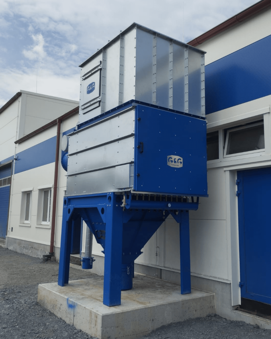 Separátor jisker před filtrační jednotkou zachytí jiskry a hrubé částice, čímž chrání filtr před poškozením a snižuje riziko požáru.